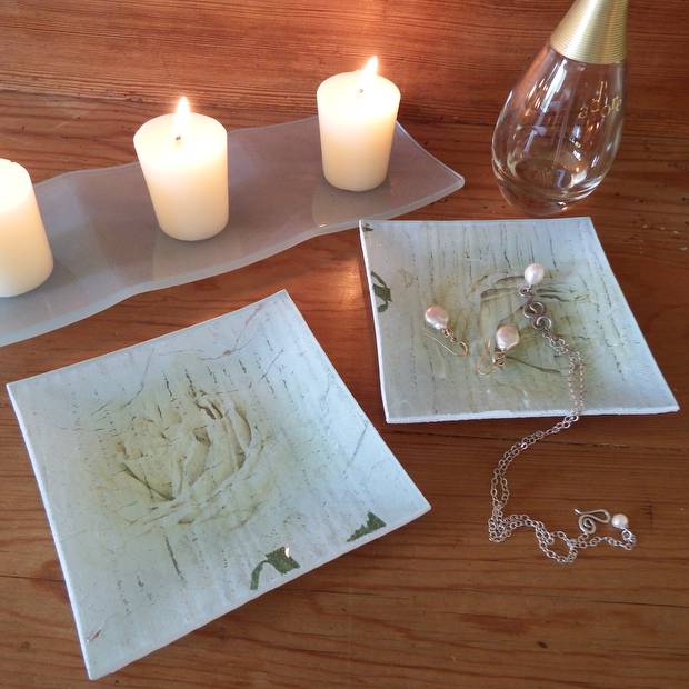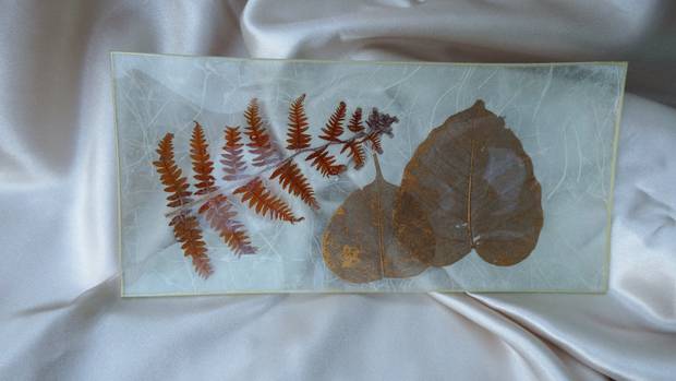 Florales plat à cake, véritables végétaux & papier japonais 27 x 13 cm plat à cake ou apéritif, véritables feuilles dorées & papier japonais 27 x 13 cm lys, plat à cake 12,5 x 26,5 cm hortensias, coupe pyramide 20 x 20 cm rose blanche, porte bijoux/savon 11,5 x 11,5 cm vides-poches 16 x 16 cm